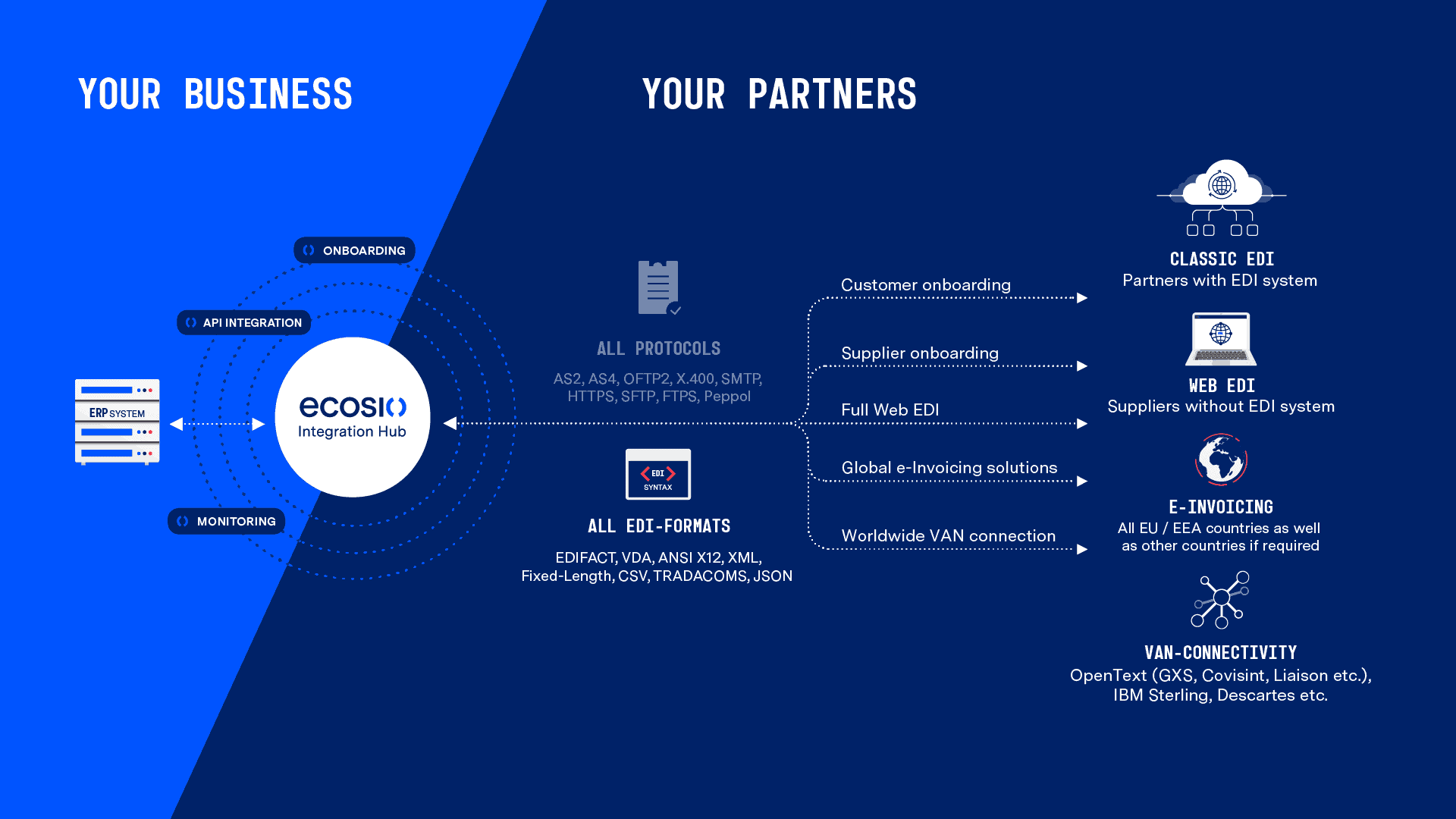 No need to worry about document types or formats – ecosio supports all commonly used EDI protocols and EDI formats.