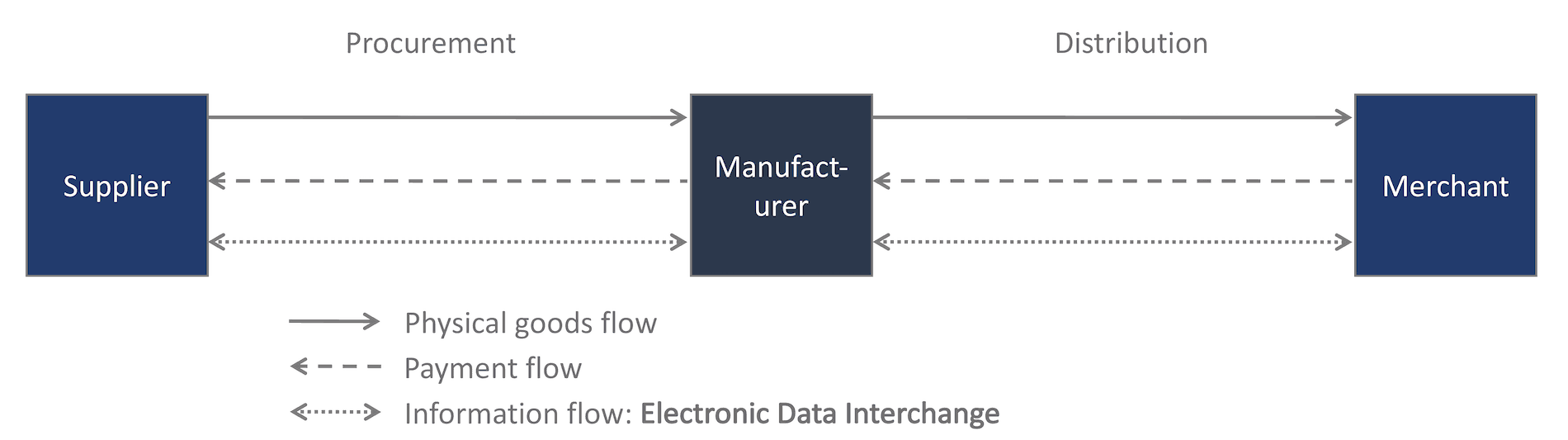 Particularly in the area of ​​supply chain management, the use of EDI plays a very important role. The following figure shows a simplified representation of a typical supply chain scenario. For a supply chain, one thinks primarily of the flow of goods and payments. However, it is only the flow of information that makes the supply chain possible in the first place.