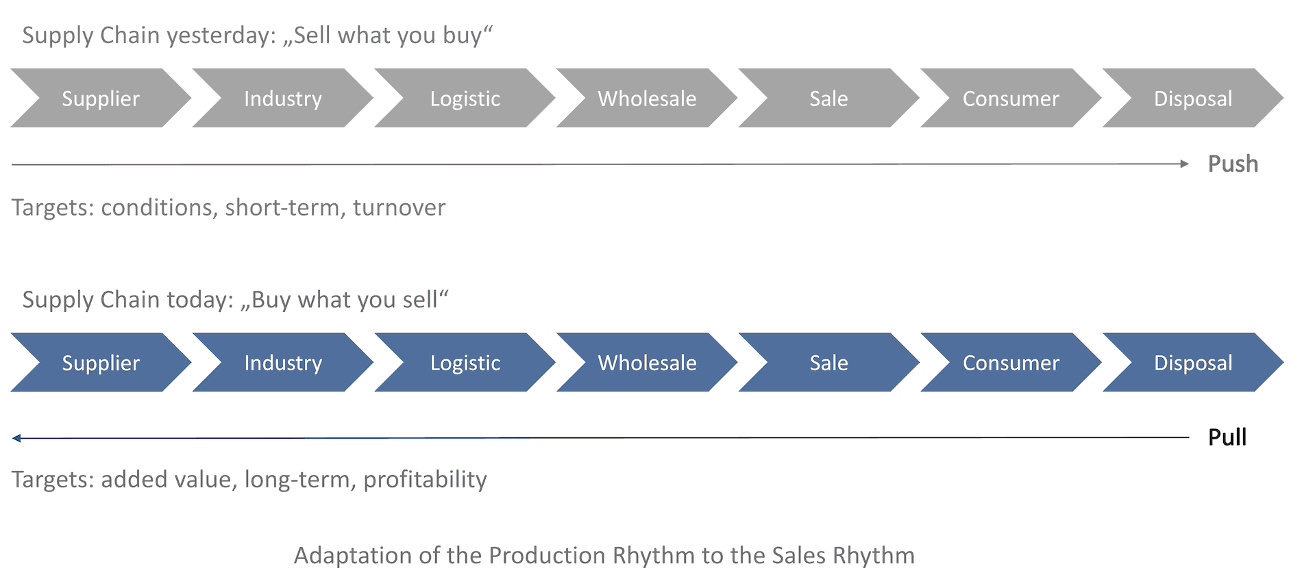 Earlier supply chains were characterised by the motto “sell what you buy”. Producing companies bought production resources, produced products and passed them on to buyers. These processes were characterised by a “push” because the sub-suppliers pushed products to the buyers. If they did not need it, the subcontractors were stuck with their stocks. Conversely, there was also the case that the demand of the buyers could not be satisfied by the offer of the producers, because too little was produced.