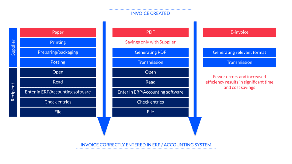 In contrast to paper or PDF invoices, the e-invoice doesn’t require any manual input from users and instead enables a fully automated approach; e-invoices allow organisations to transfer invoicing information electronically, receive it automatically, and to have that information processed within the recipient’s own system.
