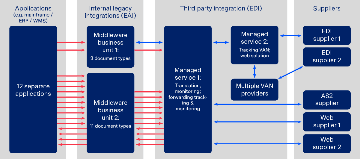 Unfortunately, however, many businesses are hampered by extremely complicated legacy IT landscapes and are therefore unable to experience the benefits of streamlined EDI. As illustrated by the diagram below (which shows the genuine IT landscape of a large retailer pre-upgrade), often legacy systems include several separate information silos and connections to multiple service providers. With no central governance and such a wealth of areas where errors could occur, internal teams are often scared to touch anything in case they disrupt or break mission critical processes.